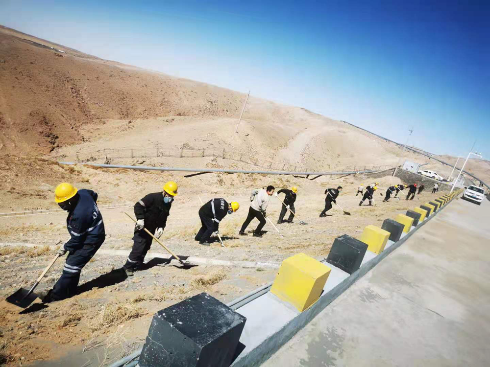 本次活動重點對基礎(chǔ)壩兩側(cè)坡面進行綜合治理,治理長度約1.5公里。面對坡陡、風大、黃沙亂舞的工作環(huán)境,黨員干部不懼困難、以身作則、俯沖一線,帶頭撿拾垃圾、清理尾砂、覆土灑水以及對安全警示牌進行維護保養(yǎng)。廣大職工緊跟其后,或一字排開,或矩陣展開,忙碌的身影遍布整個坡面,鏟車的轟鳴聲、鐵锨的吱吱聲與狂風的呼嘯聲琴簫合奏,在藍天、斜陽和荒山的襯托下,勾勒出一幅“聲與色”、“動與靜”相得益彰的勞動生產(chǎn)畫卷。